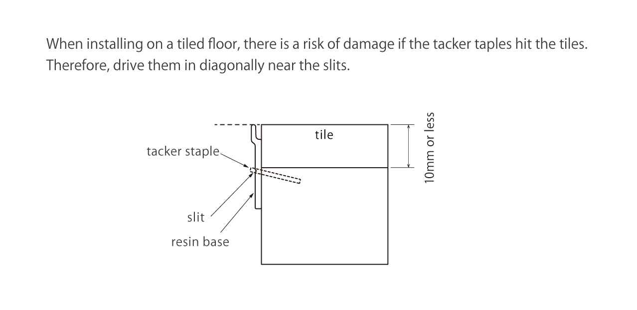 Note: When installing on a tiled floor rather than a wooden floor, there is a risk of damage if the tacker comes into direct contact with the tiles. As shown in the diagram below, make sure to fasten it from an angled position above the slit so that it hits the wooden subfloor.