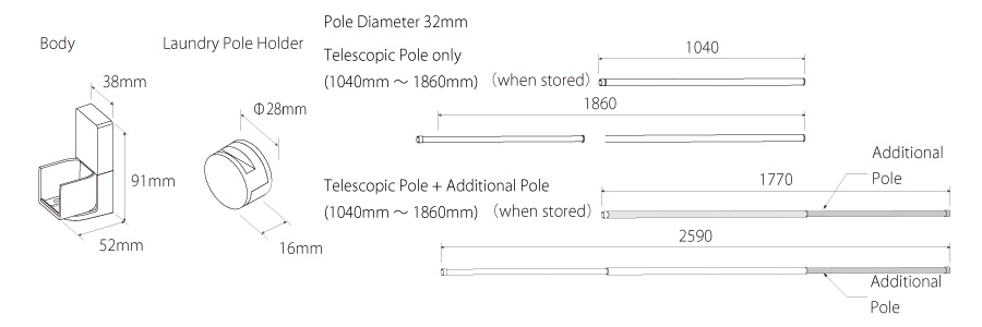 The neck of the main body swivels 60 degrees to the left and right, so you can use the space effectively. The unprecedentedly simple structure consisting only of plastic parts allows you to freely dry clothes indoors. The minimum length is 1080mm and the maximum length is 2630mm. Whether you live alone or have children in the house, these specs are suitable for all kinds of room drying.