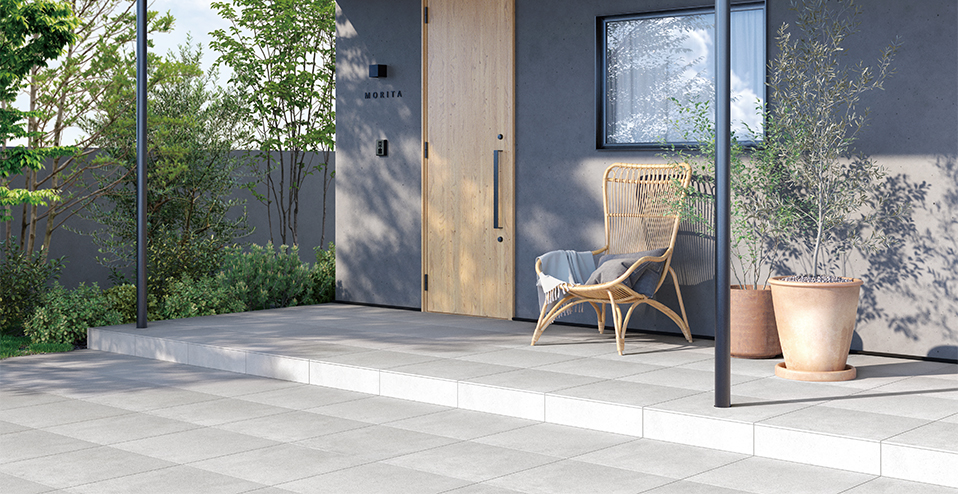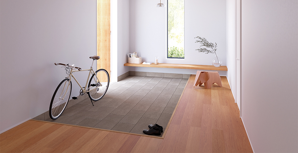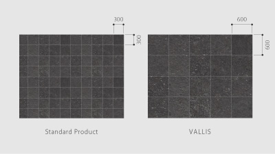 The size of tiles used in Japanese housing is often 300 mm square. In comparison, hotels use large 600 square tiles to create a sense of luxury. Cafes and stores also alternate 300mm×600mm tiles to create a strong impression of space. Can a house remain 300 mm square? VALLIS offers only two sizes, 600 mm square and 300 mm x 600 mm. We dare not offer 300 square because of our strong desire to change the standard size of Japanese residential tiles. Try to get more space with large tiles.