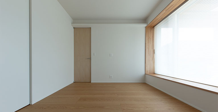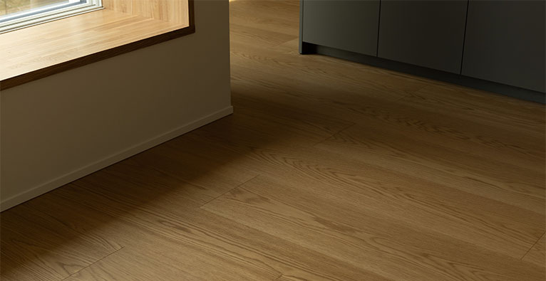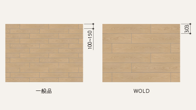 フローリングは、「幅」や「長さ」の違いで目地や木目の数が変わり、 それらによって空間の見え方は大きく変化します。幅が広い商品や 長さが長い商品は、目地や木目の数が少なくなることで、空間に のびやかな広がりと静けさを演出してくれます。