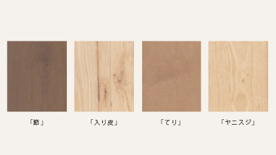 天然木は工業製品にはない様々な表情を見せてくれます。 色や柄が違うのはもちろん、枝の成長過程でできる「節」、 樹皮が巻き込まれてできる「入り皮」、木材独特の光沢「てり」、 樹液が集まってできる「ヤニスジ」など、一枚一枚全く違う 個性を持っています。この個性を楽しんでもらいたいと思い、 自然のままの姿で作りました。また、暮らしながら フローリングの変化も楽しんでもらえるよう 「経年変化」をするフローリングに仕上げました。