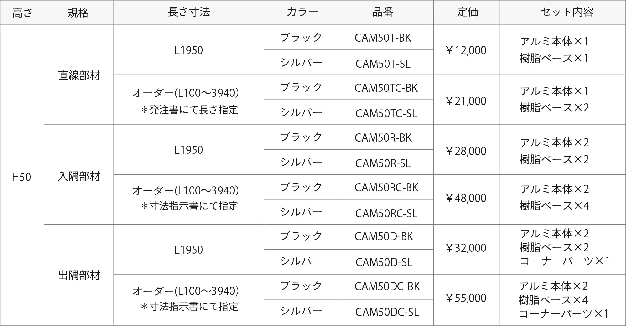 | 品名 | カラー | 定価 | セット内容 |