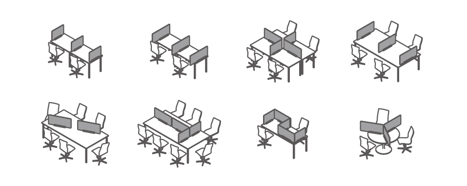 設置するデスクの種類や形状を気にすることなく、自由自在に配置することが可能です。また、工具を使わずに簡単に取外し・固定が出来るので個室ブースとして利用していた空間をミーティングスペースに変えたり、その場の目的に合わせてレイアウトを変更させるといった柔軟な使い方もできます。