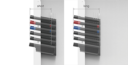サイドに配置されたマーカーホルダーは、波面の仕切板の位置を差し替える事で様々な長さのマーカーに対応させることが可能です。ボードを反転させホルダーを付け替えることで左右どちらにでも配置する ことが出来ます。