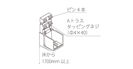 ネジとピンを組み合わせた簡単施工です。下地がある場所、ない場所どちらにも施工可能なので、首振りと組み合わせて自由なレイアウトが可能です。下地のある壁はピンとAトラスネジの組み合わせ、下地の無い壁は、ピンのみで取り付けることが可能です。