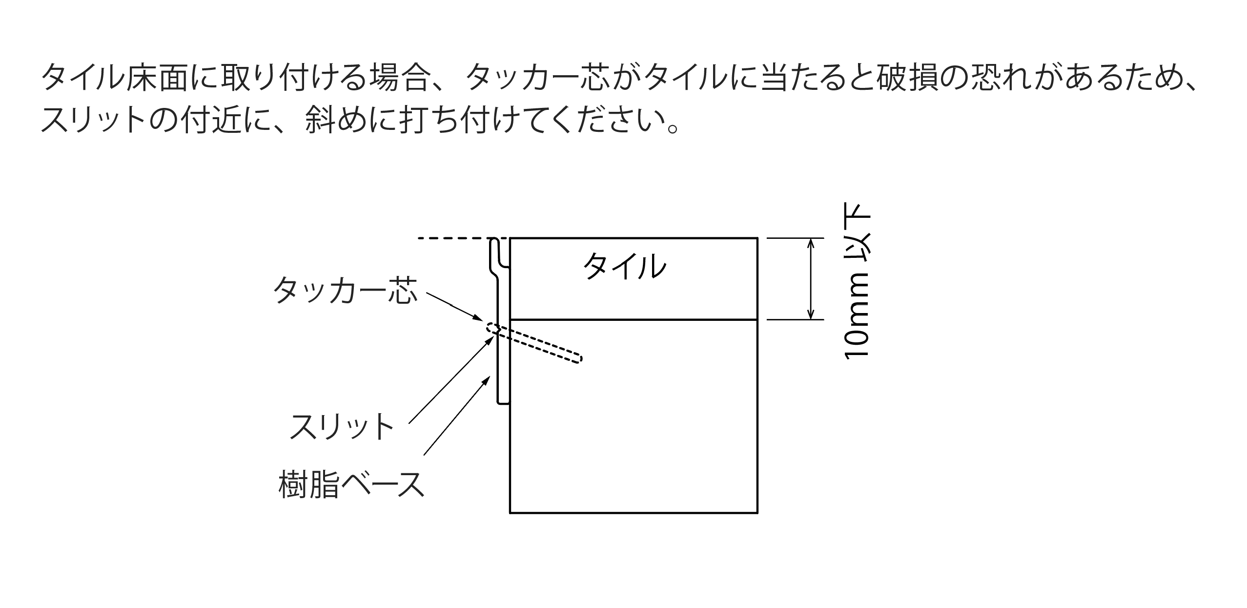 注)フローリング床ではなくタイル床に取り付ける場合は、タッカーがタイルに直接当たると破損の恐れがあるため、