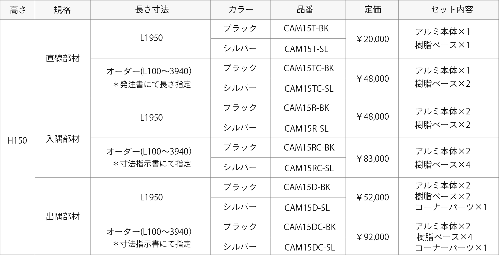 | 品名 | カラー | 定価 | セット内容 |